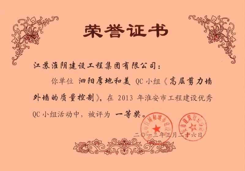 2013年市工程建设优秀QC一等奖 泗阳厚地和美-高层剪力墙外墙的质量控制(戴月平)